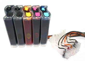 The whole system consists of a set of empty cartridges with tubes attached, 5 reservoir bottles(100ml), 2 tubing brackets, 5 vacuum pumps assembly for filling and installation instructions. The inks are optional.